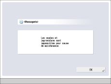 Après avoir consulté les messages, fermer la messagerie en appuyant sur [OK] pour effectuer les opérations normales. Cette messagerie convient pour afficher des messages détaillés, sans perturber les autres opérations. Le message réapparaît lorsque la machine est mise hors tension, puis de nouveau sous tension, ou lorsque le mode de réinitialisation automatique est activé. | |