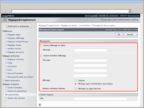 Activer la fenêtre d'affichage: | Pour afficher la messagerie dans une fenêtre contextuelle sur l'afficheur tactile. Si [Affichage sur page d'accueil] est sélectionné, la messagerie s'affiche sur la page de portail de l'interface utilisateur distante. |