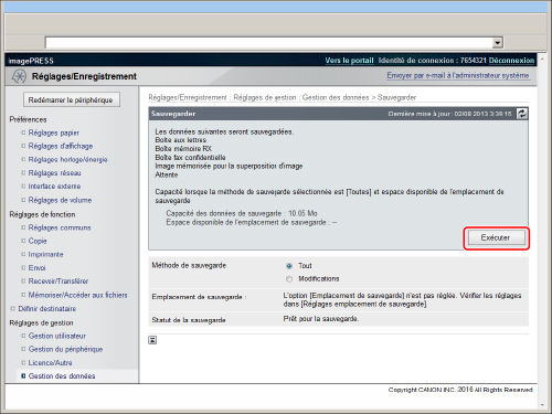 Ne pas lancer la sauvegarde dans le cas suivant. La procédure de sauvegarde ne démarre pas normalement et une erreur se produit. Si une opération est effectuée avec l'option Support mémoire à partir de l'afficheur tactile. Si le message <Une erreur serveur s'est produite.> s'affiche, il se peut que les réglages réseau du dossier de destination des sauvegardes soient incorrects. Pour plus d'informations sur les réglages réseau, voir "Réseau". |