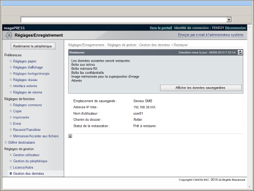 Pour afficher le journal de sauvegarde/restauration, cliquer sur [Réglages/Enregistrement] → [Gestion des données] → [Journal de sauvegarde/restauration]. Pour restaurer des données de sauvegarde cryptées, saisir le même mot de passe que celui utilisé lors de la sauvegarde. En fonction des réglages de la machine, il se peut que les données de sauvegarde ne soient pas complètement restaurées ou que certains documents soient imprimés automatiquement. La restauration est effectuée une fois toutes les données stockées dans la machine ou après l'effacement des documents en cours d'envoi, de réception ou de stockage. |