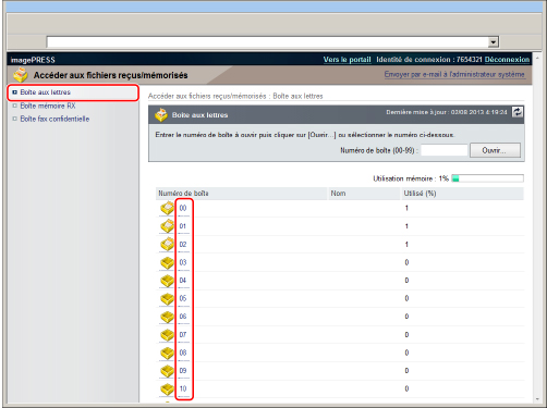 Cliquer sur [Accéder aux fichiers reçus/mémorisés] → sélectionner [Boîte aux lettres] → cliquer sur le numéro de la boîte aux lettres souhaitée.