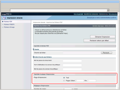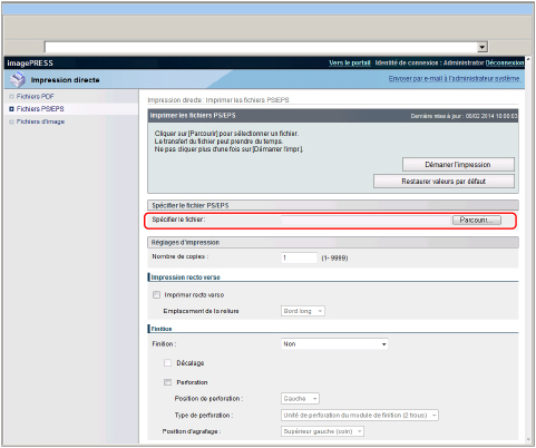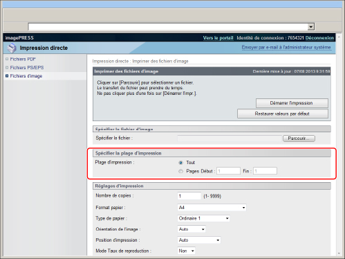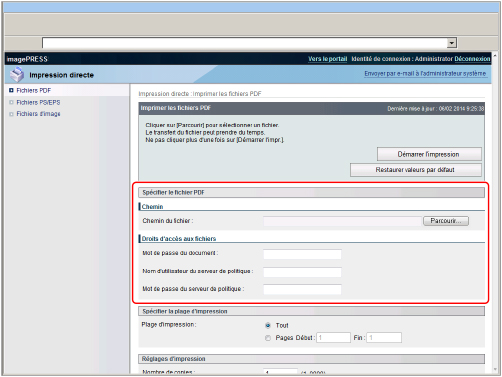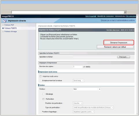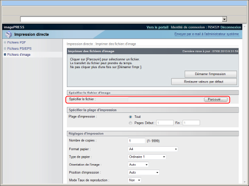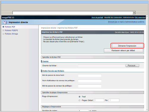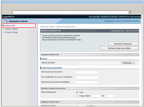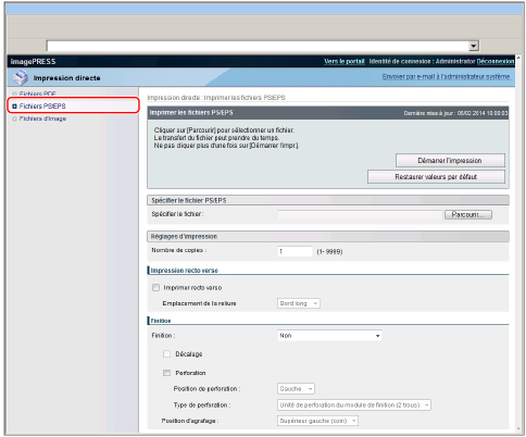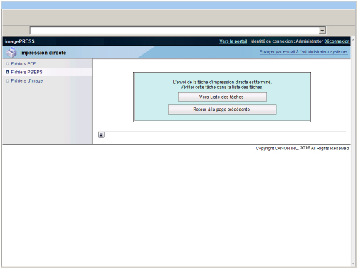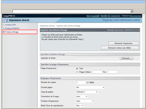 Pour imprimer directement des fichiers PS/EPS à partir de l'interface utilisateur distante, Kit de Connexion PS/PCL pour imagePRESS est nécessaire. |