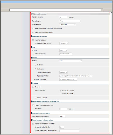 [Imprimer les commentaires] | Ce réglage spécifie d'imprimer ou non les annotations. Si [Non] est sélectionné, aucune annotation ne s'imprime. Si [Auto] est sélectionné, seules les annotations dont l'impression est indiquée dans le fichier PDF s'impriment. |