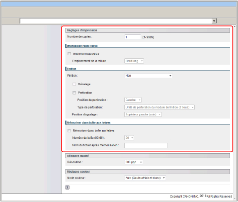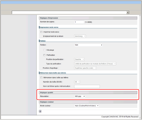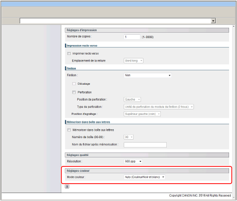 [Mode couleur] | Ce réglage permet de définir le mode couleur à l'impression. Si [Auto (Couleur/Noir et blanc)] est sélectionné, la machine change automatiquement entre le mode couleur et le mode noir selon le type de document. Si [Noir et blanc] est sélectionné, les données s'impriment en noir (N) uniquement, même si l'original est en couleur. Si [Quadrichromie] est sélectionné, cyan (C), magenta (M), jaune (J) et noir (N) sont utilisés. |