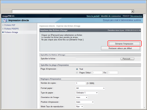 Pour restaurer les réglages par défaut, cliquer sur [Restaurer valeurs par défaut]. Ne pas cliquer à plusieurs reprises sur [Démarrer l'impression] lors du transfert d'un fichier. Cette opération peut prendre du temps. Cependant, en cas de clics répétitifs pendant le transfert, il est possible que le fichier soit endommagé et que le transfert n'ait pas lieu. |