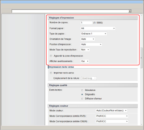 [Position d'impression] | Cette option indique la position d'impression de l'image. Si [Auto] est sélectionné, l'image s'imprime à la position définie sur la feuille si la position d’impression de l’image a été précisée. Si la position d'impression de l'image n'a pas été précisée, l'image s'imprime au milieu de la feuille. Si [Centre] est sélectionné, l'image s'imprime au milieu de la feuille quel que soit le réglage de la position d'impression de l'image. Si [En haut à gauche] est sélectionné, l'image s'imprime en haut à gauche de la feuille quel que soit le réglage de la position d'impression de l'image. |