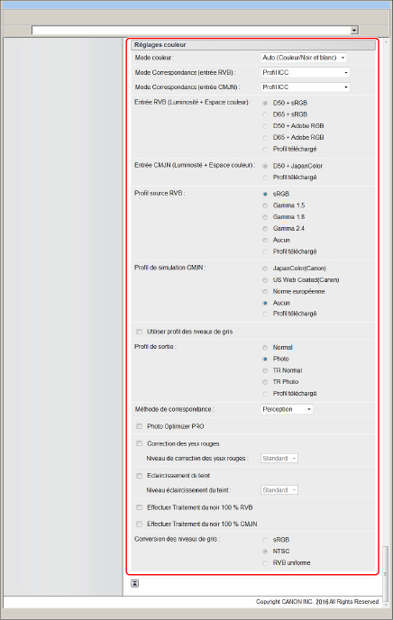 [Entrée RVB (Luminosité + Espace couleur)] | Ce réglage permet d'effectuer la mise en correspondance des couleurs pour les données entrantes RVB. [D50 + sRGB] Ce réglage effectue la mise en correspondance des couleurs pour correspondre aux conditions d'un éclairage ambiant D50 (5 000 k) sur un moniteur compatible sRGB. [D65 + sRGB] Ce réglage effectue la mise en correspondance des couleurs pour correspondre aux conditions d'un éclairage ambiant D65 (6 500 k) sur un moniteur compatible sRGB. [D50 + Adobe RGB] Ce réglage effectue la mise en correspondance des couleurs pour correspondre aux conditions d'un éclairage ambiant D50 (5 000 k) sur un moniteur compatible Adobe RGB. [D65 + Adobe RGB] Ce réglage effectue la mise en correspondance des couleurs pour correspondre aux conditions d'un éclairage ambiant D65 (6 500 k) sur un moniteur compatible Adobe RGB. [Profil téléchargé] Ce réglage spécifie les profils téléchargés de l'ordinateur hôte sur cette machine. Si le mode de couleurs est réglé sur [Noir et blanc], ce réglage n'est pas valide. |