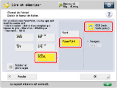 Même si l'option [OCR (rech. texte poss.)] est sélectionnée, le texte risque de ne pas être détecté correctement dans certains cas.(Voir "Si la fonction OCR (recherche de texte possible) ne s'exécute pas correctement".) |