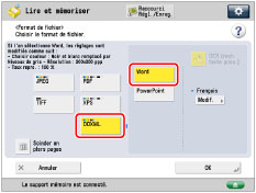 Pour modifier la langue à utiliser lors de la reconnaissance optique de caractères, appuyer sur [Modif.], sélectionner une langue, puis appuyer sur [OK]. Sélectionner une langue ou un groupe de langues sur une liste déroulante selon la langue utilisée sur les documents lus. (Voir "Si la fonction OCR (recherche de texte possible) ne s'exécute pas correctement".) |