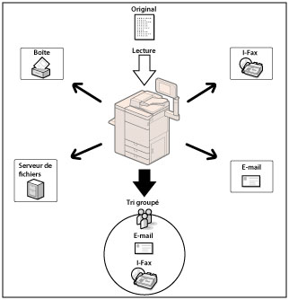 Pour qu'il soit possible d'envoyer des documents lus vers une adresse e-mail ou I-Fax ou un serveur de fichiers, les réglages réseau doivent avoir été paramétrés. (Voir "Réglages de communication communs pour les e-mails/I-Fax".) |