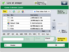 Appuyer sur [Rechercher par nom] pour fermer l'écran permettant d'affiner le carnet d'adresses et revenir à l'écran précédent. L'option [Ttes] permet d'afficher tous les destinataires mémorisés sous un bouton de composition 1 touche. Cependant, il est impossible de supprimer les destinataires enregistrés sous des boutons de composition 1 touche. Pour plus d'informations sur la suppression des réglages enregistrés sous un bouton de composition 1 touche, voir "Mémorisation/modification/suppression des boutons de composition 1 touche". Pour annuler un destinataire sélectionné, le sélectionner une nouvelle fois. Pour afficher [Numéro d'accès], régler [Gérer n° d'accès au carnet d'adresses] sur "Oui". (Voir "Gestion du carnet d'adresses avec des numéros d'accès".) Pour afficher le destinataire du fax, régler <Activer Fax dans fonction Lire et Envoyer> pour [Afficher fonction Fax] sur "Oui". (Voir "Affichage de la fonction Fax".) |
