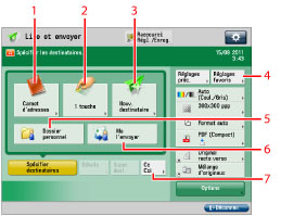 Les destinataires suivants ne peuvent pas être modifiés si un type de destinataire est défini sur "Oui" dans [Limiter nouveau destinataire]. Sélectionner un destinataire mémorisé à l'aide du carnet d'adresses local, du carnet d'adresses distant ou du serveur LDAP sous [Carnet d'adresses], ou en appuyant sur un bouton de composition 1 touche sous [1 touche]. (Voir "Restriction de l'envoi à de nouvelles adresses".) |