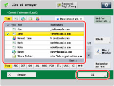 Le carnet d'adresses local peut être enregistré et importé à l'aide de l'interface utilisateur distante. (Voir "Chargement des informations réglages (Importer individuellement)".) Si un seul destinataire est sélectionné, appuyer sur pour procéder à l'envoi à partir de l'écran Carnet d'adresses. |