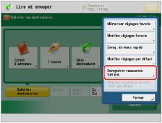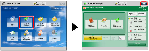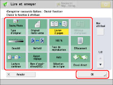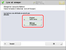Deux raccourcis des options sont affichés dans l'écran Lire et envoyer. Les options définies par défaut sont [Original recto verso] et [Mélange d'originaux]. Ces raccourcis peuvent être modifiés pour des fonctions utilisées fréquemment.