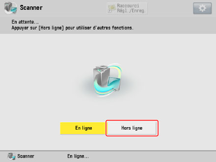 Certains modèles d'imprimante permettent de configurer le scanner pour une mise hors ligne automatique (voir "Hors ligne auto"). Il n'est pas nécessaire de mettre le scanner hors ligne pour utiliser d'autres fonctionnalités pendant le transfert de données. Si l'on appuie sur [Hors ligne] lors d'une opération de numérisation, une boîte de dialogue invite l'utilisateur à confirmer l'arrêt de la numérisation. Cliquer sur [Oui] pour arrêter la numérisation et mettre le scanner hors ligne. |