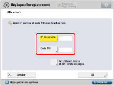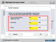 Appuyer sur [Oui] pour les fonctions (sauf les fonctions de copie/d'impression) dont l'accès doit être limité au moyen de la gestion des numéros de service.