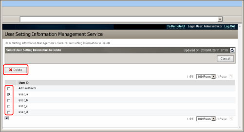 Sélectionner la méthode de suppression des informations de réglage utilisateur dans la page du service de gestion des informations de réglage utilisateur.