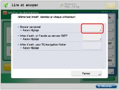 Les informations utilisateur peuvent être mémorisées avec dans l'écran Fonctions de base [Lire et envoyer], l'écran Envoi [Accès fich. enregistrés], et l'écran Envoi [Boîte Fax/I-Fax]. |