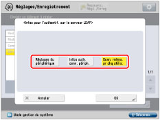 [Réglages du périphérique] : | Utilise les informations d'authentification définies sous [Mémoriser serveur LDAP]. (Voir "Mémorisation d'un serveur LDAP".) D'autres réglages ne sont pas requis pour chaque utilisateur. |