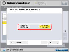 [Réglages du périphérique] : | Utilise les informations pour l'authentification du serveur SMTP définies dans la machine. (Voir "Réglages de communication communs pour les e-mails/I-Fax".) D'autres réglages ne sont pas requis pour chaque utilisateur. |