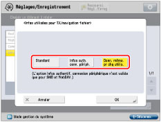 [Standard] : | Utilise les informations pour l'authentification du serveur de fichiers définies dans la machine. (Voir "Mémorisation de l'adresse d'un serveur de fichiers".) D'autres réglages ne sont pas requis pour chaque utilisateur. |
