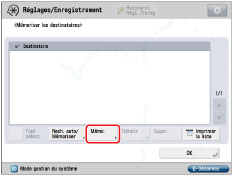 Le nombre maximal de destinations pouvant être enregistrées est 100. Pour plus d'informations sur la liste de destination de la distribution des informations de périphérique, voir "LISTE DESTINATAIRE DISTRIBUTION INFOS PERIPHERIQUES". |