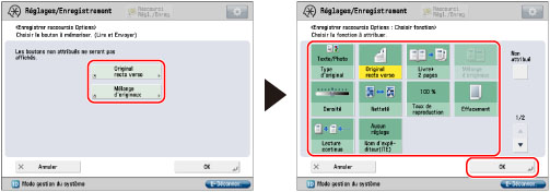 Appuyer sur une touche de raccourci → choisir le réglage à mémoriser dans la touche → appuyer sur [OK].