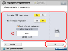 Sélectionner [Oui] pour que le Rapport de gestion des communications s'imprime automatiquement lorsque le nombre de transmissions (envoi et réception) atteint 100.