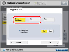 Pour plus d'informations sur le rapport TX d'émission, voir "RAPPORT TX FAX/RAPPORT ERREUR TX FAX". Si [Rapport TX] sous [Réglages de fonction] (Réglages/Enregistrement) est défini sur "Erreur seulement" ou "Oui", un rapport TX d'émission est imprimé avec le Rapport TX Fax. Si une multidiffusion est effectuée lorsque Rapport TX Fax est défini sur "Oui", un Rapport Fax multidiffusion est imprimé. (Voir "RAPPORT MULTI TX FAX".) |