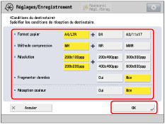 Définir les conditions de réception en fonction des spécifications de la machine du destinataire. Une erreur de transmission peut survenir si les conditions définies ne sont pas prises en charge par la machine du destinataire. |
