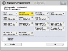 Il est possible de mémoriser les types de papier chargés ne figurant pas sur la liste des réglages détaillés. Pour plus d'informations sur la mémorisation des types de papier, voir "Présentation de cette fonction". Lors de la mémorisation d'un type de papier personnalisé comme source papier, les réglages du type de papier sont protégés et il est impossible de modifier les informations détaillées sur le type de papier personnalisé ou de supprimer le type de papier personnalisé sous [Réglages de gestion du type de papier] de [Préférences] (Réglages/Enregistrement). |
