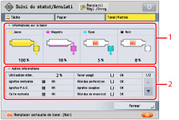 Les informations sur la quantité restante de toner s'affichent dans la partie supérieure ; les autres informations s'affichent dans la partie inférieure de l'écran Toner/Autres.