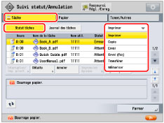 Les icônes sur la gauche de l'écran indiquent le statut des tâches. Pour plus d'informations sur les types et les détails des icônes, voir "Icônes de l'écran Tâche". Si le type de tâche [Impression] est sélectionné, la durée d'attente approximative de chaque tâche à traiter s'affiche. Si la saisie du mot de passe est requise pour un document sécurisé en attente, " --- min" s'affiche pour la durée d'attente approximative de cette tâche à traiter. |