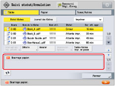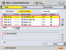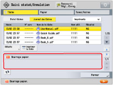 La mention <NG> (No Good, ou incorrect) s'affiche dans le journal à côté de la tâche annulée. Si le papier spécifié lors de l'émission de la tâche n'est pas disponible, un message invite l'utilisateur à charger le papier approprié. Charger le papier et reprendre la tâche. Si [Délai tâche en suspens] sous [Réglages de fonction] (Réglages/Enregistrement) est défini sur "Oui", la tâche suspendue en raison de l'indisponibilité du papier d'impression s'affiche en tant que tâche suspendue au terme d'un délai spécifié. Pour reprendre l'impression de la tâche suspendue, charger le papier → sélectionner la tâche → appuyer sur [Détails] → [Reprise]. |