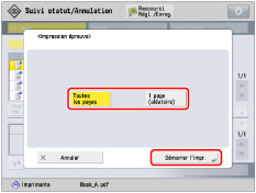 Dès que l'impression de l'épreuve est terminée, la machine reprend automatiquement la tâche. Si les réglages doivent être modifiés, appuyer sur [Annuler] ou [Toutes tâches impr. en pause] puis apporter les modifications nécessaires. |