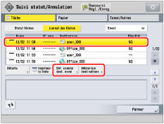 [Déf. comme dest. envoi]: | Affiche un écran dans lequel l'adresse de la tâche sélectionnée est saisie. Vérifier l'adresse → appuyer sur [OK] pour afficher l'écran Envoi. |