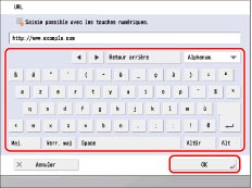 Pour plus d'informations sur la saisie de caractères, voir "Saisie de caractères sur l'afficheur tactile". Selon le type de zone de saisie de la page Web, le champ de texte associé au clavier peut s'afficher avec plusieurs lignes de saisie. Selon la taille de la page Web ou des images, la page Web risque de ne pas s'afficher correctement ou un message d'erreur peut apparaître. Suivant la taille de l'image, les animations GIF peuvent mettre un certain temps à se charger. Si plusieurs fenêtres sont ouvertes, elles ne sont pas différenciées et les URL sont enregistrées dans leur ordre de saisie. |