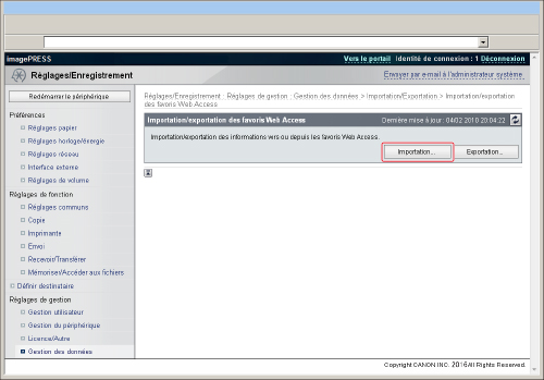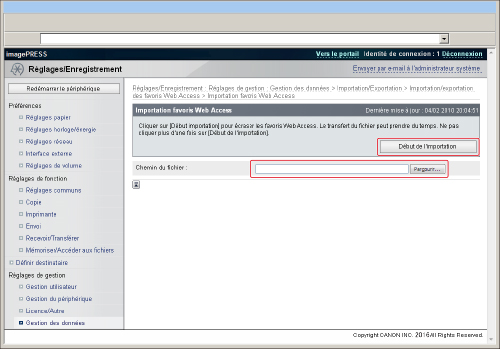 Lors de l'importation de favoris à partir d'un fichier d'ordinateur, les favoris déjà enregistrés dans la machine sont écrasés. Lors de l'importation d'un fichier, utiliser le même format de fichier que celui des données exportées. Les données ayant un format différent ne peuvent pas être importées. |