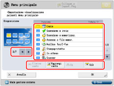 Per specificare le impostazioni della schermata Menu principale, è necessario accedere alla macchina come amministratore. Per default, le impostazioni del gestore del sistema (ID gestore sistema/PIN sistema) sono impostate sulla macchina. Pertanto, l'amministratore deve collegarsi immettendo l'ID del gestore del sistema ed il PIN di sistema nella schermata Impostazioni/Registrazione. L'impostazione predefinita per ID gestore sistema e PIN sistema è '7654321'. Se il numero dei pulsanti di selezione delle funzioni supera il numero di pulsanti nel layout specificati per <Impostazioni visualizzazione pulsanti Menu principale>, i pulsanti in eccesso vengono visualizzati dopo la pagina 2 della schermata Menu principale. Sulla schermata Menu principale si possono visualizzare non più di 16 pulsanti. Se si preme [Mostra tutti] nella schermata Menu principale, vengono visualizzati tutti i pulsanti nell'ordine predefinito, anche se il layout dei pulsanti è stato modificato. Per ritornare alla schermata personalizzata, premere nuovamente [Mostra tutti]. Per maggiori informazioni su [Variazione lingua/tastiera], vedere "Attivazione di Variazione lingua/tastiera". Per maggiori informazioni su [Regolazione automatica gradazione], [Impostazioni carta] e [Impostazioni gestione tipo di carta], vedere "Regolazione automatica della gradazione"., "Registrazione del formato e tipo di carta per una fonte di alimentazione", e "Panoramica di questa funzione". Le interruzioni di riga utilizzate durante la registrazione delle pagine web sono visualizzate nel nome dei pulsanti delle pagine web nella schermata Menu principale. |