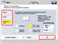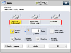 Per informazioni sui prodotti opzionali, vedere gli argomenti seguenti: Se [Finitura] non è impostato, i fogli vengono stampati con le stesse modalità utilizzate quando è impostato [Raggruppam. (stesse pagg)]. Se [Fascicolazione automatica] è impostato su 'On', verranno impostati automaticamente i modi Fascicolazione o Sfalsamento Fascicolazione quando si posizionano gli originali nell'alimentatore. (Vedere "Attivazione della fascicolazione automatica".) È possibile visualizzare le informazioni dettagliate della carta selezionata premendo [Dettagli]. |