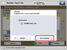 Non è possibile stampare più file contemporaneamente. Per stampare più file, selezionare e stampare un file per volta. Se si imposta 'Off' per <Blocco in memoria I-Fax>, i file ricevuti con la funzione I-fax vengono stampati automaticamente ed eliminati dalla mailbox RX memoria. |