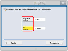 Le operazioni disponibili nella schermata Impostazioni/Registrazione variano a seconda se si è amministratori o utenti generici. Per gli amministratori: Il gestore del sistema e l'amministratore di sistema SSO-H (Administrator) possono specificare tutte le impostazioni di sistema della macchina. Per informazioni sui tipi di amministratori, vedere "Impostazioni amministratore". Per impostazione predefinita, la macchina richiede le impostazioni del gestore del sistema (ID gestore sistema/PIN sistema). Pertanto, l'amministratore deve accedere immettendo l'ID del gestore del sistema e il PIN del sistema. L'impostazione predefinita per entrambi è '7654321'. Si consiglia di modificare l'ID gestore sistema e il PIN sistema. Per ulteriori informazioni sull'impostazione dell'ID gestore sistema e il PIN sistema, vedere "Specifica delle impostazioni del gestore del sistema". Per informazioni sulle voci di Impostazioni/Registrazione disponibili con i privilegi di amministratore, vedere "Tabella delle impostazioni disponibili per gli amministratori (pannello digitale)" e "Tabella delle impostazioni disponibili per gli amministratori (IU remota)". Per utenti generici: Alcuni elementi della schermata Impostazioni/Registrazione possono non essere disponibili per gli utenti generici. Gli elementi che per cui l'utente non dispone di privilegi operativi appaiono ombreggiati e non possono essere selezionati sul pannello digitale. Gli elementi che per cui l'utente non dispone di privilegi operativi appaiono ombreggiati e non possono essere selezionati sull'IU remota. |