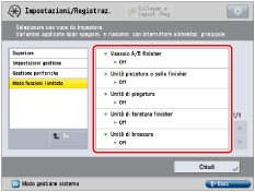 Il Modo funzioni limitate è abilitato solo dopo aver riavviato la macchina (l'alimentazione principale viene spenta e riaccesa). Per istruzioni sul riavvio (alimentazione principale OFF e ON) della macchina, vedere "Alimentazione principale e tasto risparmio energetico". |