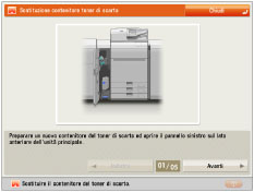 Per istruzioni dettagliate sulla sostituzione del serbatoio del toner di scarto, selezionare [Indietro] o [Avanti] sul pannello digitale. Quando occorre sostituire il serbatoio del toner di scarto mentre è in corso un lavoro di stampa, la stampa si interrompe e riprende dopo che il serbatoio del toner di scarto è stato sostituito. |