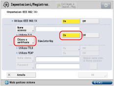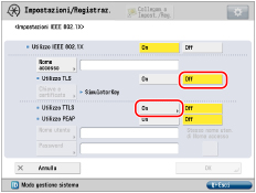 Se si imposta <Utilizzo TLS> su 'On', non è possibile impostare <Utilizzo TTLS> o <Utilizzo PEAP>. |