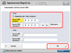 Se [BOOTP] o [DHCP] vengono impostati su 'On' al punto 5, l'indirizzo IP di un server DNS impostato manualmente viene sovrascritto. |