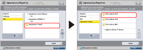 Si consente la trasmissione dei dati con tutti i computer, ma non con computer specificati. | [On] | [Consentire] | Registrazione dell'indirizzo IPv4 o del prefisso dell'indirizzo IPv4 che si vuole rifiutare. |
