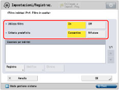 Si consente la ricezione dei dati da tutti i computer, ma non da computer specificati. | [On] | [Consentire] | Registrazione dell'indirizzo IPv4 o del prefisso dell'indirizzo IPv4 che si vuole rifiutare. Registrazione del numero di porta per le funzioni che si vuole rifiutare. |