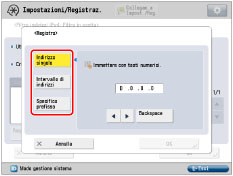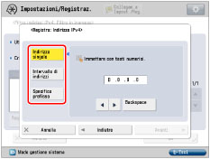 È possibile registrare fino a 16 numeri di porta o per gli indirizzi IPv4, gamme di indirizzi o prefissi di indirizzi IPv4. Si possono registrare 50 numeri di porta per un'impostazione di numero di porta. |