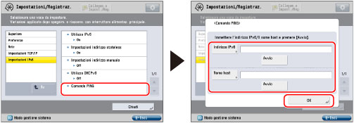 Premere [Comando PING] per [Impostazioni IPv6] → specificare le voci indicate di seguito → premere [OK].
